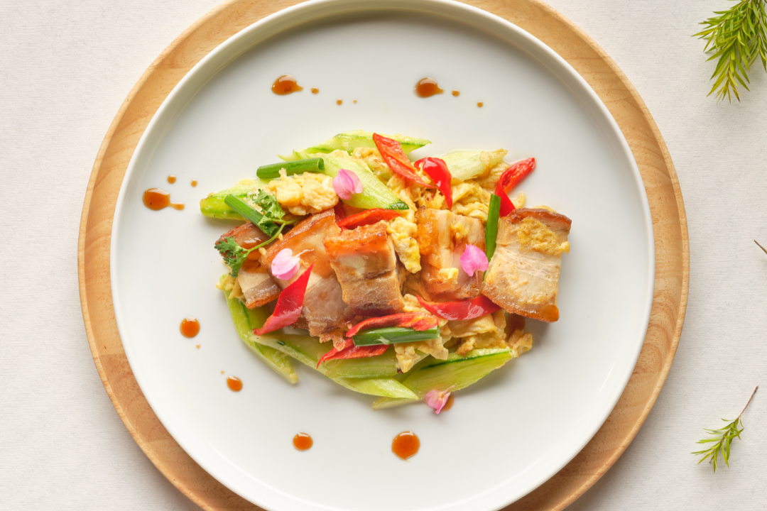 stir-fried minced chicken with garlic, chili, sweet peas, and basil